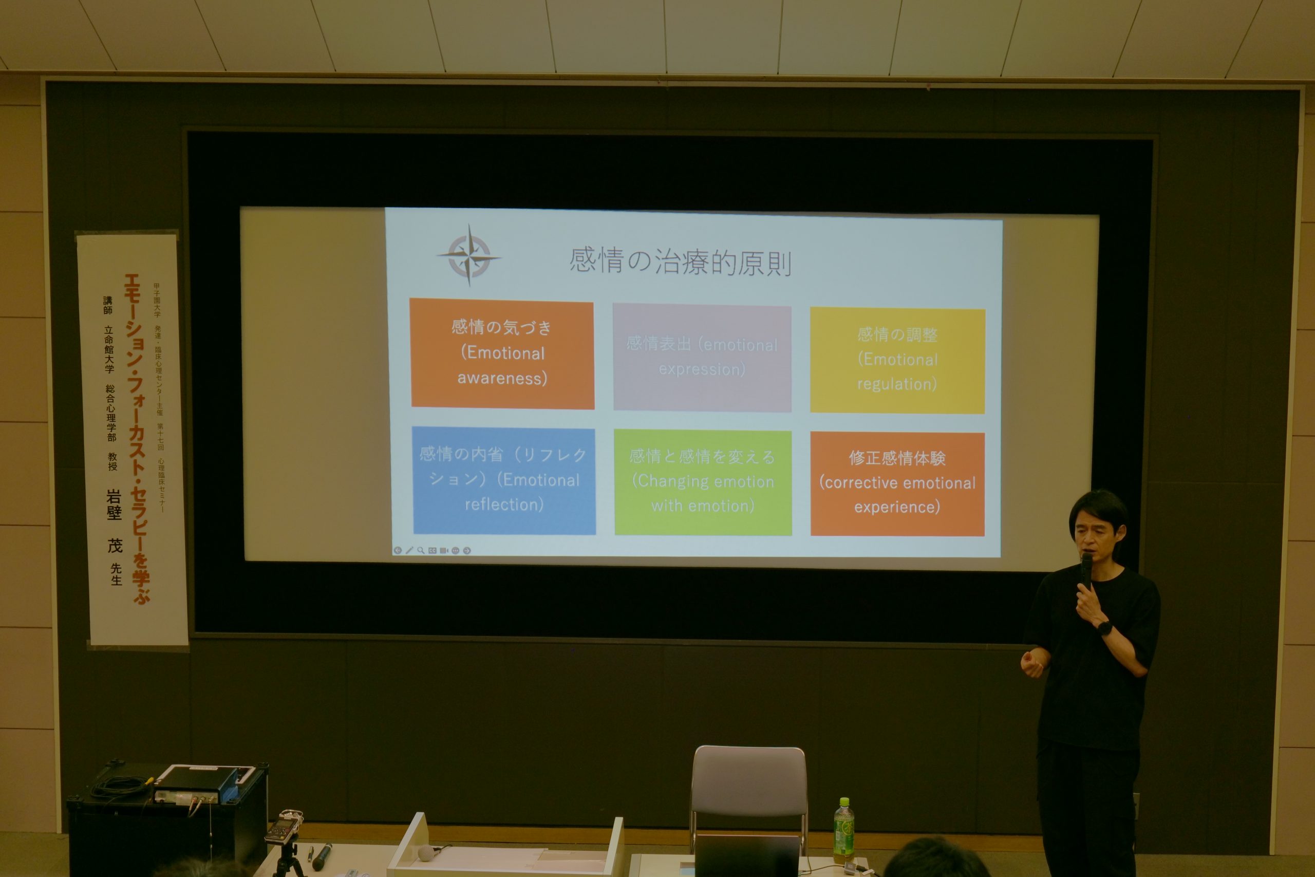 セミナーでは、発達・臨床心理センター長の東斉彰教授の開会あいさつの後、第一部として岩壁先生に「エモーション・フォーカスト・セラピー入門」のご講義を、第二部として本学大学院修了生の松延優善氏の事例提供に対してコメントをいただき、その後参加者を交えて討論を行いました。
