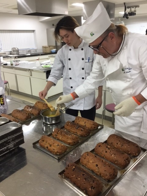本場ドイツで人気のある製法で、バター、白ワインとラム酒に漬け込んだフルーツを使用したワンランク上のシュトーレンを作りました。学生は丁寧に生地をこね、仕上げのグラニュー糖、粉糖も丁寧にかけて、立派な作品を作り上げ、季節感のあるお菓子について楽しく学ぶ事ができました。
