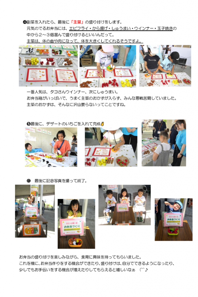 子ども達がフェルトで作ったお弁当の具材をお弁当箱に詰めながら、栄養バランスについて楽しく学んでもらうのが今回の目的です。