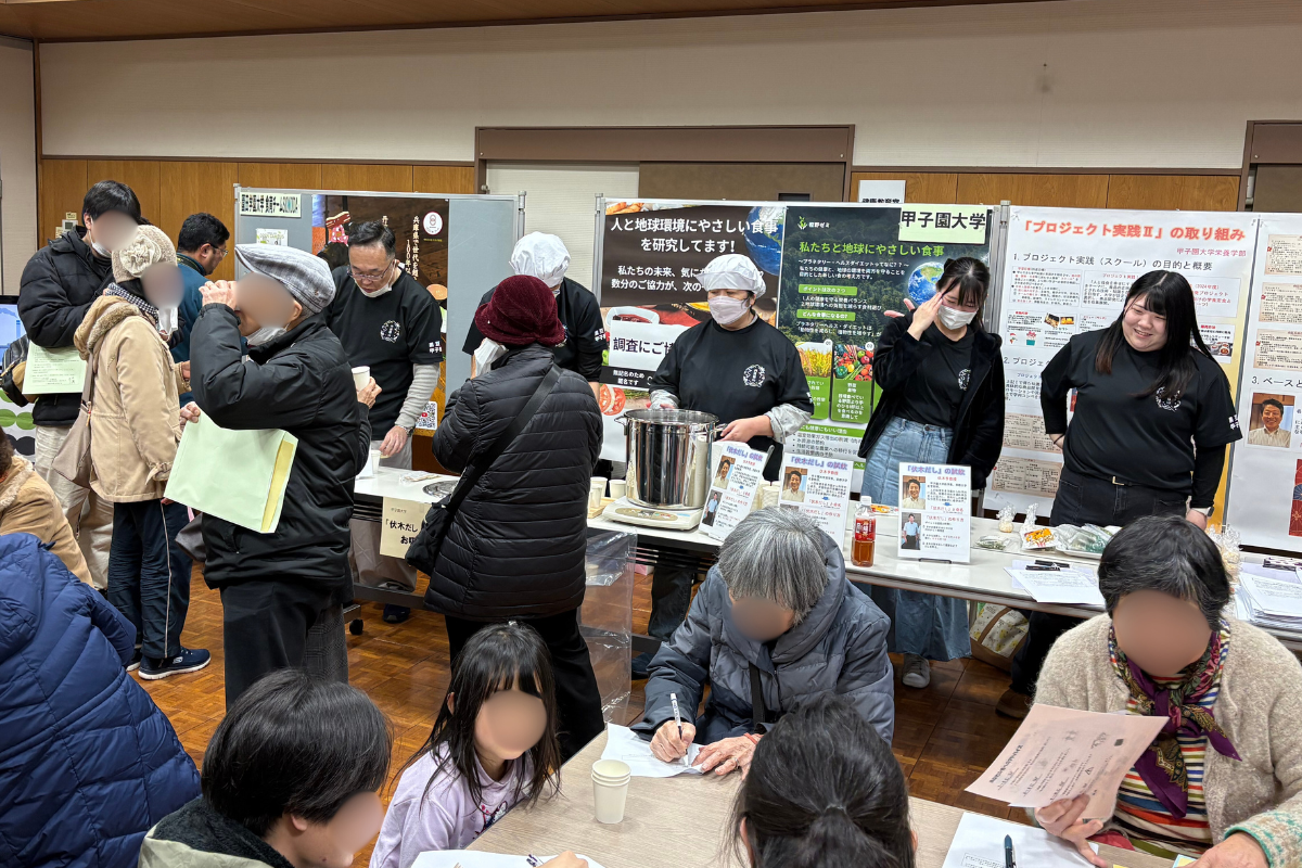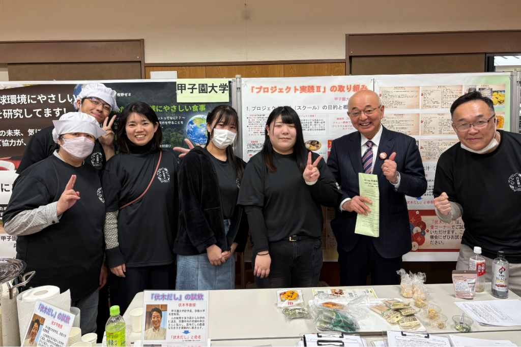 授業「プロジェクト実践Ⅱ」の成果を基に、だしの試飲を通して日本の食文化の魅力を体験的に紹介するとともに、SDGsに配慮した食に関する展示やアンケート調査も行いました。
