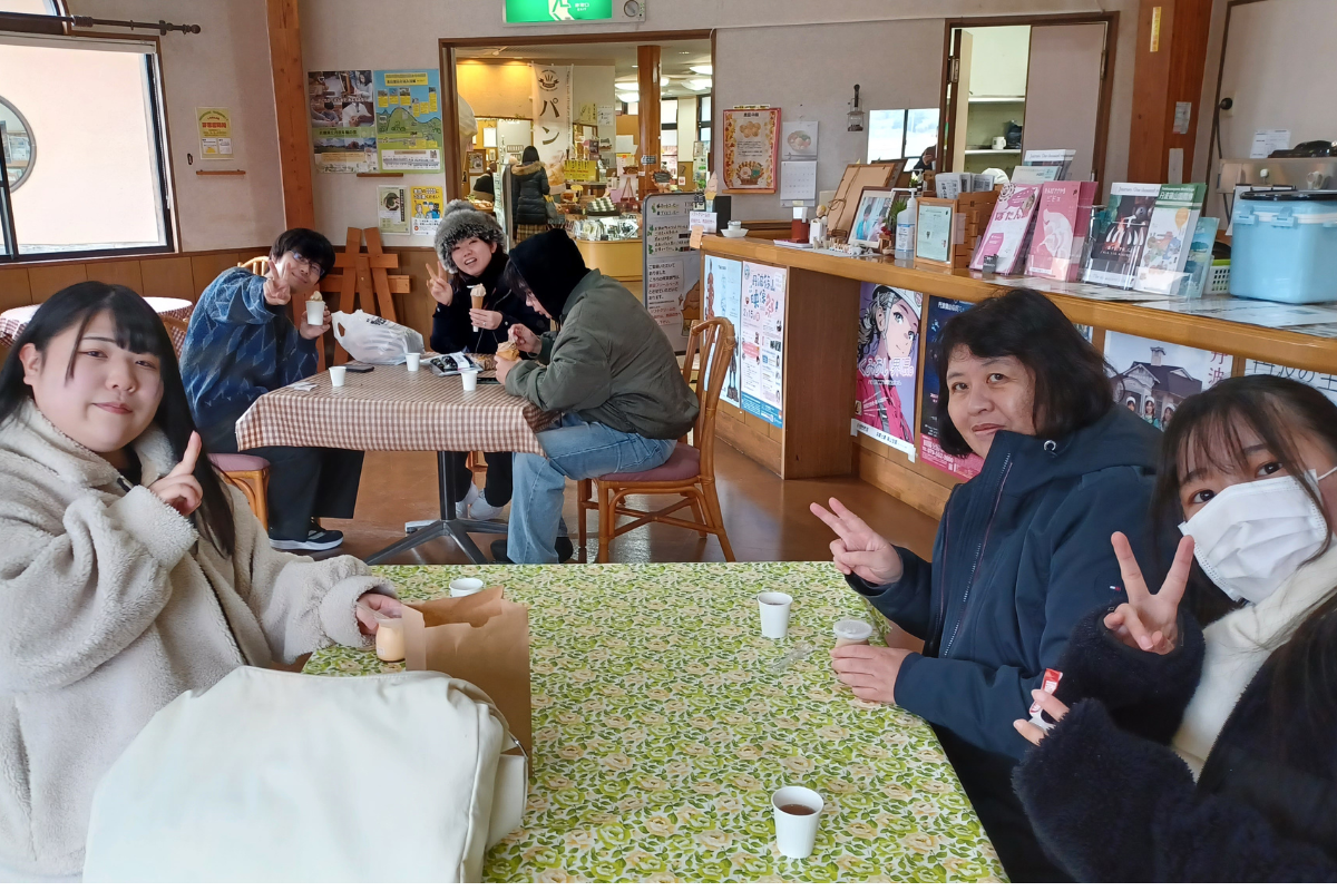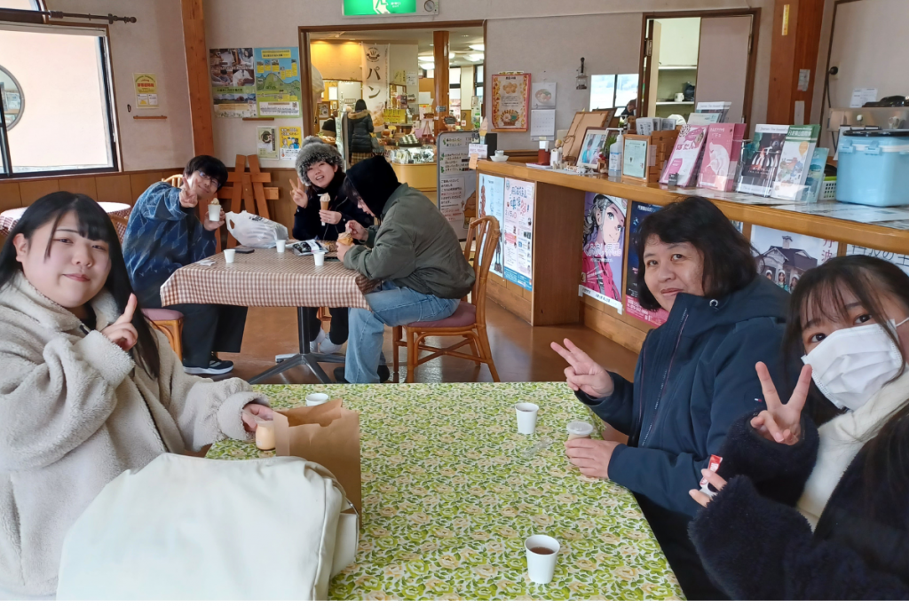 大会の参加後には、お世話になっている黒豆の館さんにお邪魔し、丹波地域の特産品である黒豆を使用したアイスとプリンを購入し、学びの締めとしました。デザートを食べながらも活発な意見交換は続きました。今後も本学は、教育・研究成果の地域への還元と、地域との連携強化を一層進めてまいります。