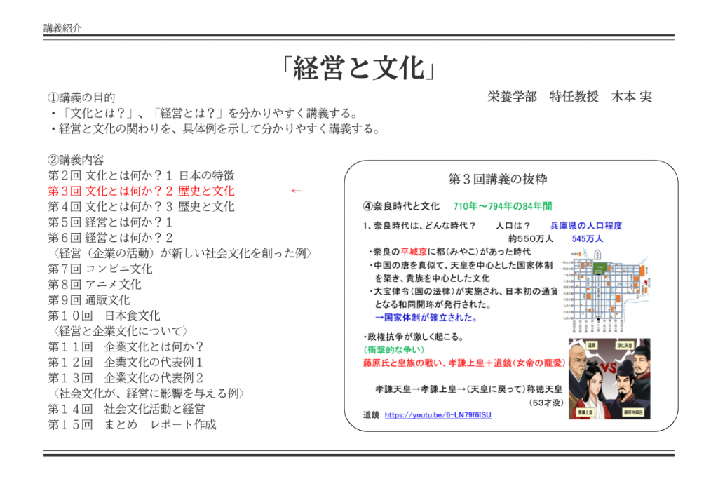 栄養学部の木本特任教授による「経営と文化」の講義では、学生たちに馴染みのない“経営”について“文化”と関係づけてわかりやすく講義しています。