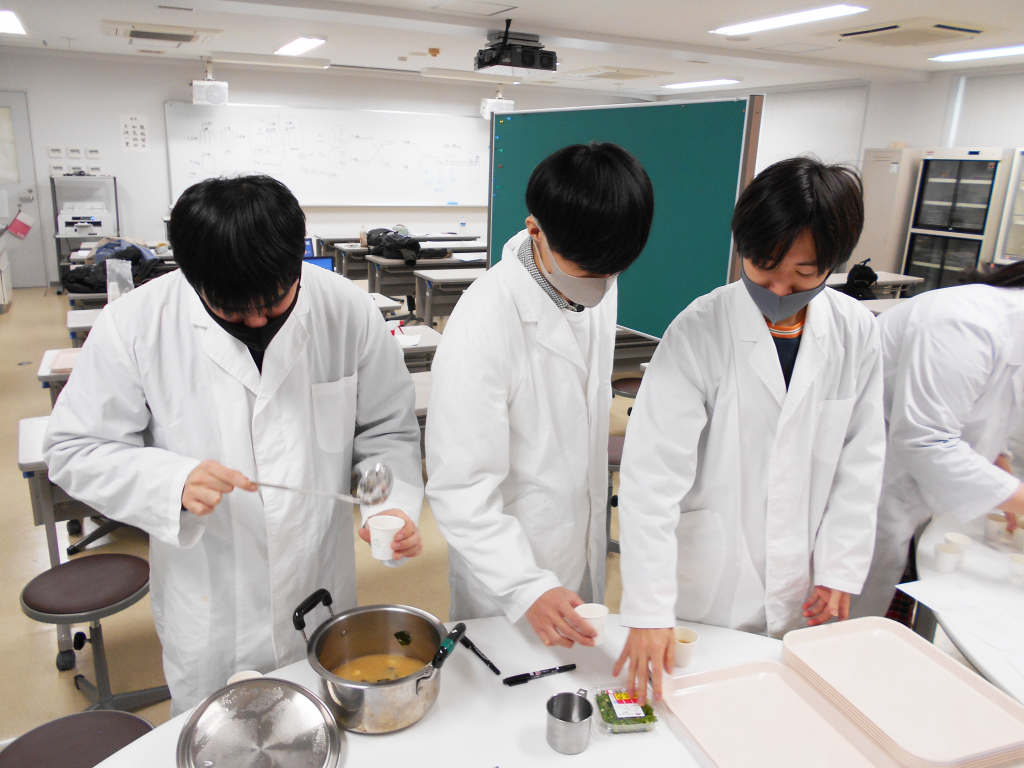 今日は、食品加工学実習で作った味噌4種類と市販の味噌2種類を使ってみそ汁をつくり、官能評価して一番おいしい味噌を決定しました。味噌を作る際には、空気を抜く作業が力仕事で大変でした。